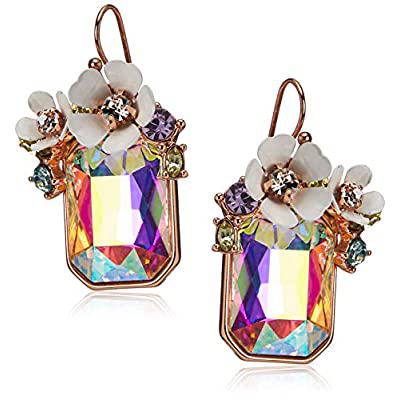 Drop earrings featuring iridescent rectangle-shaped stone embellished with flower and mixed stone cluster. Earrings are set in rose gold-tone metal with a fish hook closure.