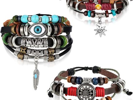 Hicarer 3 Pieces Womens Boho Beaded Bracelets Vintage Bohemia Beaded Bracelet Evil Eye Vintage Handmade PU Leather Bracelet Multilayer Hand Woven Wristbands Bracelet Jewelry for Men and Women